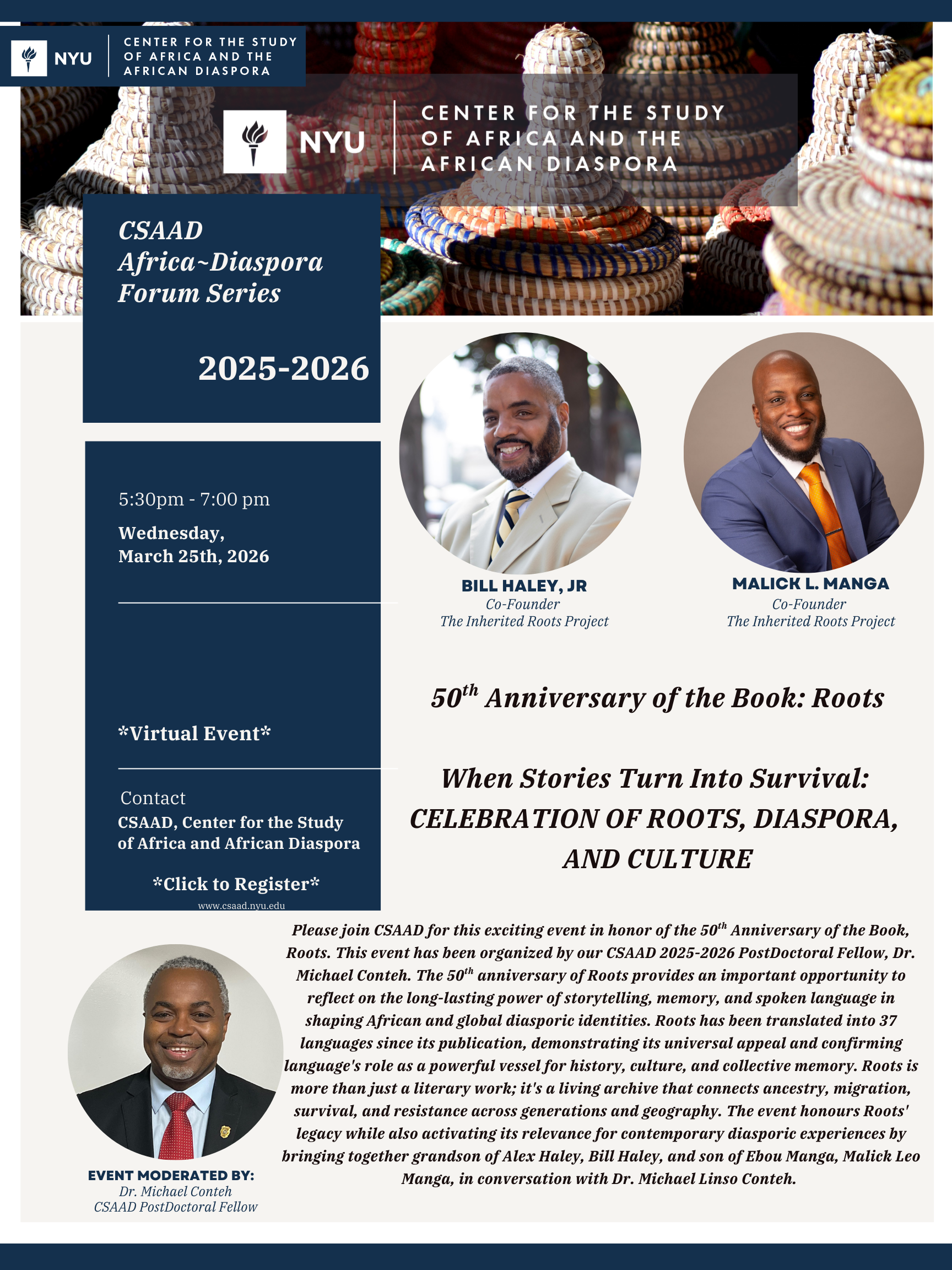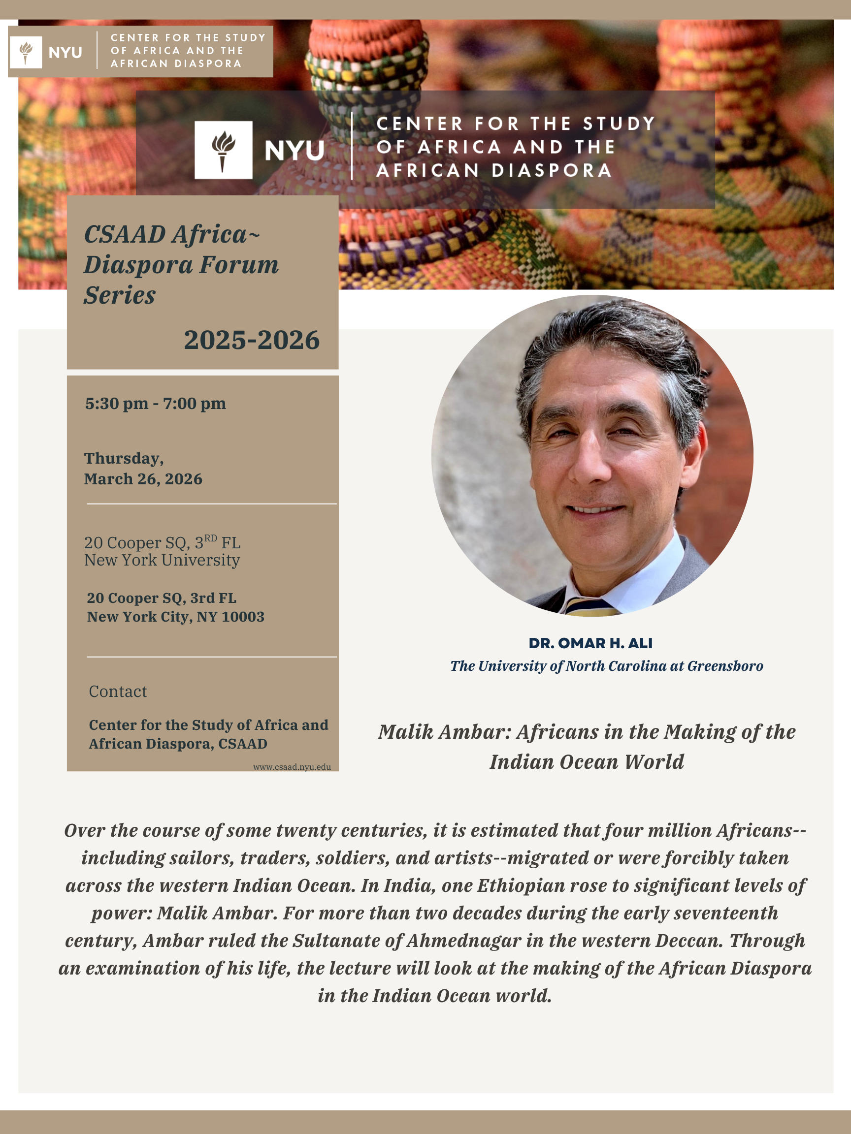 20 Cooper SquareCSAAD Africa~Diaspora Forum Series Dr. Omar H. Ali The University of North Carolina at Greensboro Thursday, March 26, 2026 5:30 pm - 7:00 pm 20 Cooper SQ, 3rd FL New York City, NY 10003 Zoom link: https://nyu.zoom.us/j/98819563241 Over the course of some twenty centuries, it is estimated that four million Africans--including sailors, traders, soldiers, and artists--migrated […]