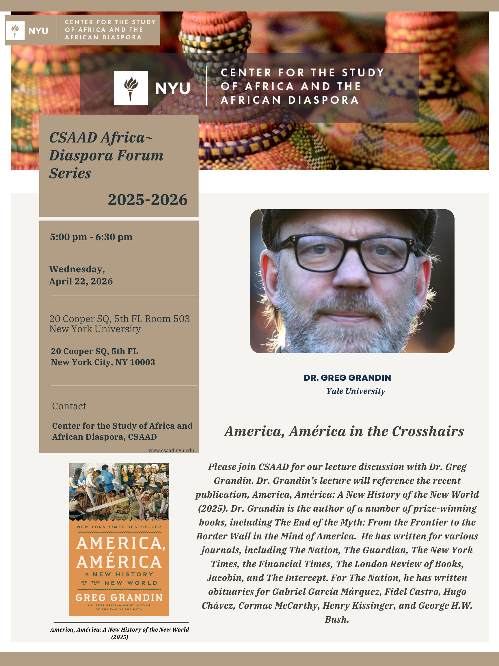 20 Cooper SquareCSAAD Africa~Diaspora Forum Series Dr. Greg Grandin Yale University Wednesday, April 22, 2026 5:00 pm - 6:30 pm 20 Cooper SQ, 5th FL Room 503 New York City, NY 10003 Zoom link: https://nyu.zoom.us/j/92032892806 Please join CSAAD for our lecture discussion with Dr. Greg Grandin. Dr. Grandin’s lecture will reference the recent publication, America, América: A New […]