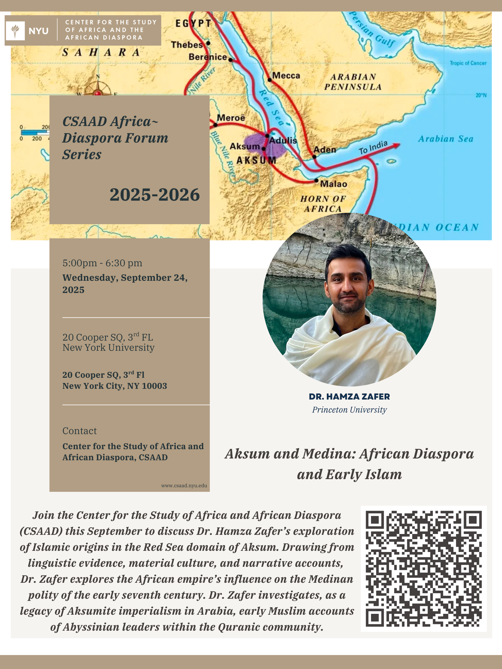 20 Cooper SquareCSAAD Africa~Diaspora Forum Series Dr. Hamza Zafer Princeton University Tuesday, September 24, 2025 5:00 pm - 6:30 pm 20 Cooper SQ, 5 FL, Room 503 New York City, NY 10003 Zoom link: https://nyu.zoom.us/j/93654463712 Join the Center for the Study of Africa and African Diaspora (CSAAD) this September to discuss Dr. Hamza Zafer’s exploration of Islamic origins […]