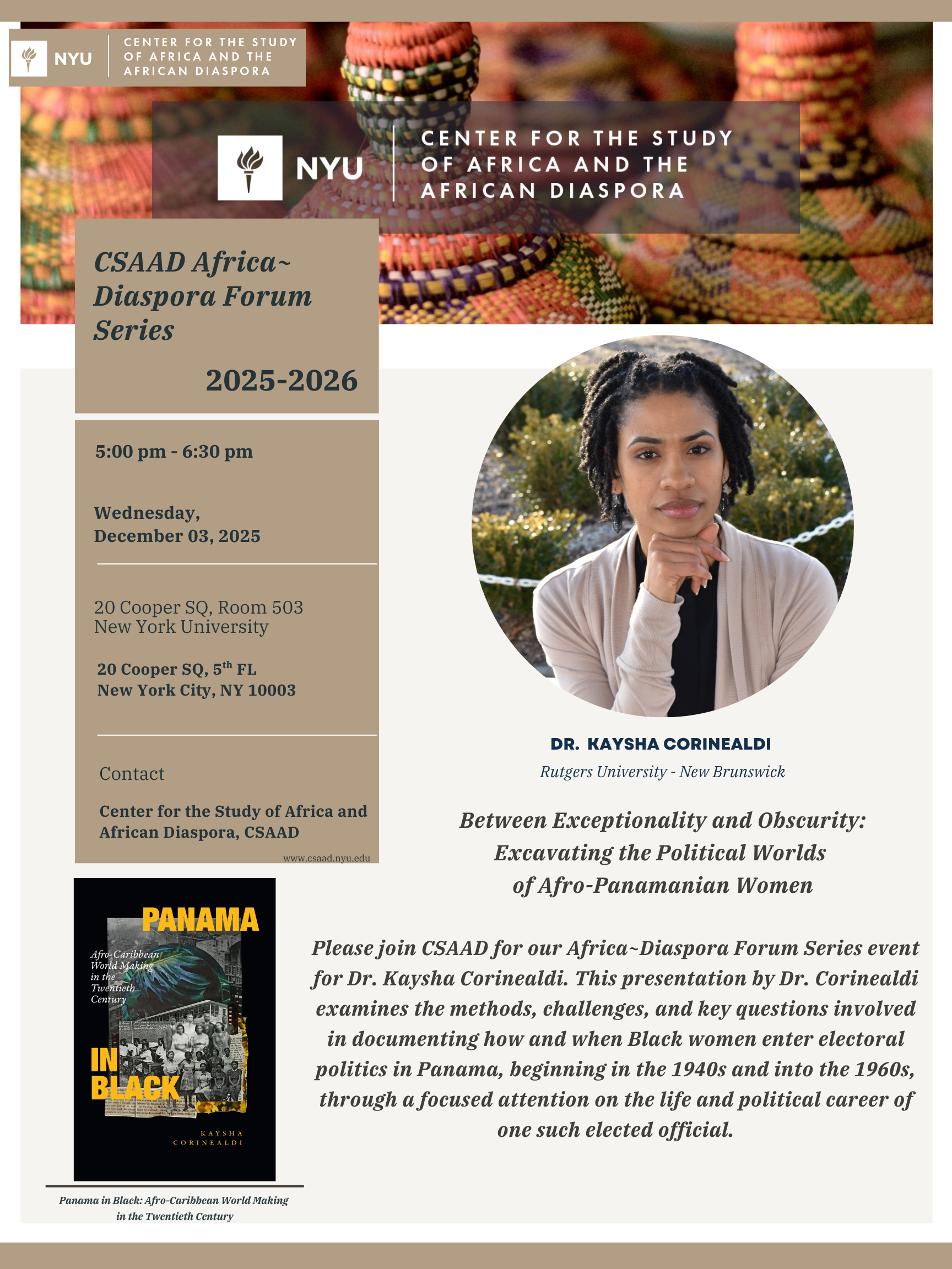 For accommodations, please contact the Program Manager for the Center for the Study of Africa and the African Diaspora at ac8829@nyu.edu.