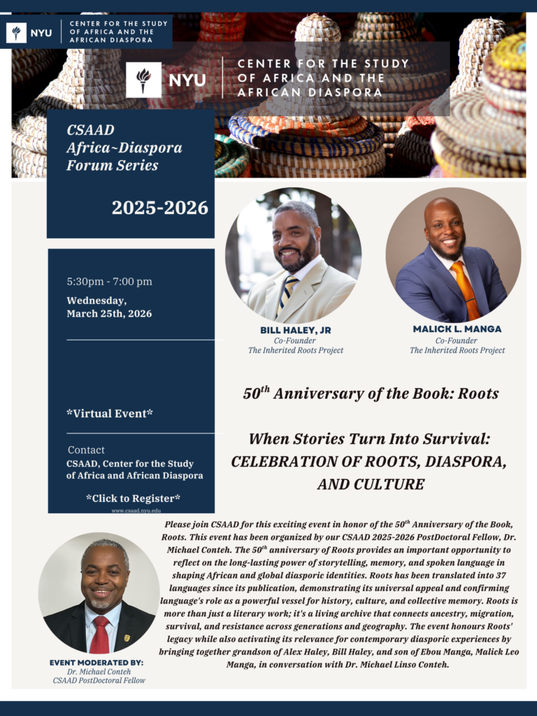 For accommodations, please contact the Assistant Director for the Center for the Study of Africa and the African Diaspora at ac8829@nyu.edu.