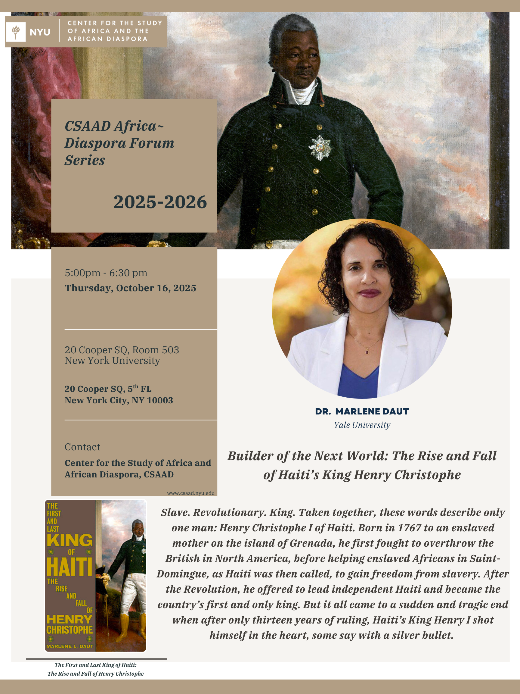 For accommodations, please contact the Program Manager for the Center for the Study of Africa and the African Diaspora at ac8829@nyu.edu.