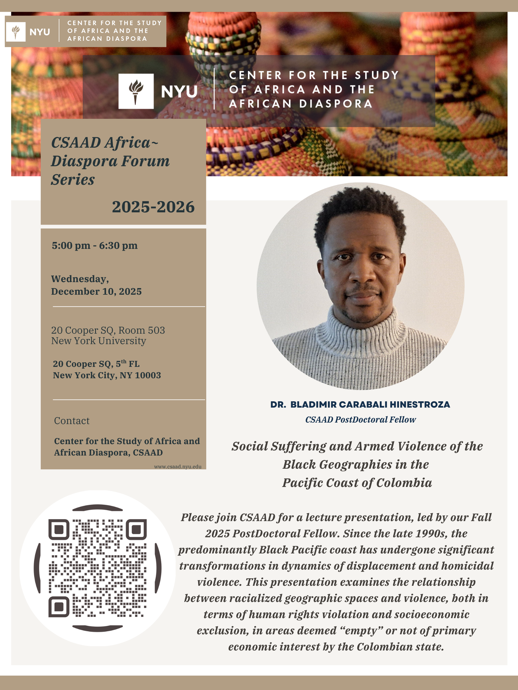 For accommodations, please contact the Assistant Director for the Center for the Study of Africa and the African Diaspora at ac8829@nyu.edu.