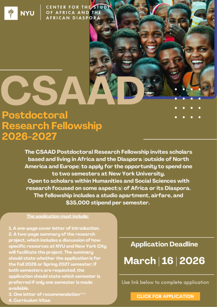 The CSAAD Research Fellowship invites scholars based based and living in Africa and the Diaspora (outside of North America and Europe), who have completed the PhD within the last four years, to submit applications for the opportunity to spend either one or two semesters at New York University. The fellowship is open to scholars in the Humanities and Social Sciences, and the research must focus on some aspect(s) of Africa or its Diaspora.