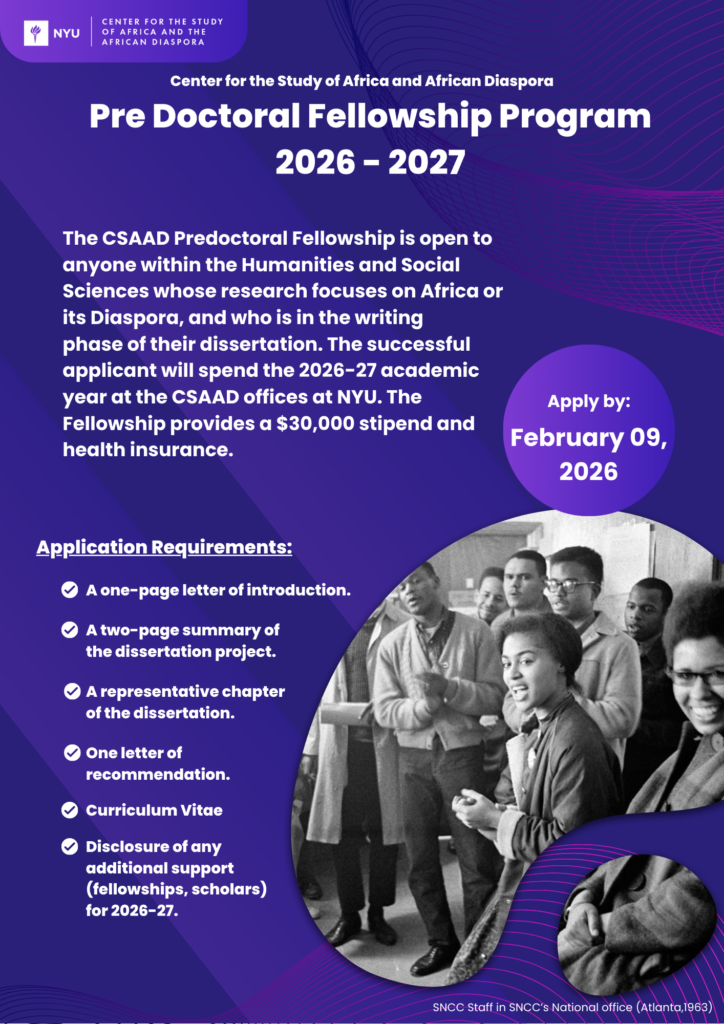 The CSAAD Predoctoral Fellowship is open to anyone within the Humanities and Social Sciences whose research focuses on Africa or its Diaspora, and who is in the writing phase of their dissertation. The successful applicant will spend the 2026-27 academic year at the CSAAD offices at NYU. The Fellowship provides a $30,000 stipend and health insurance.